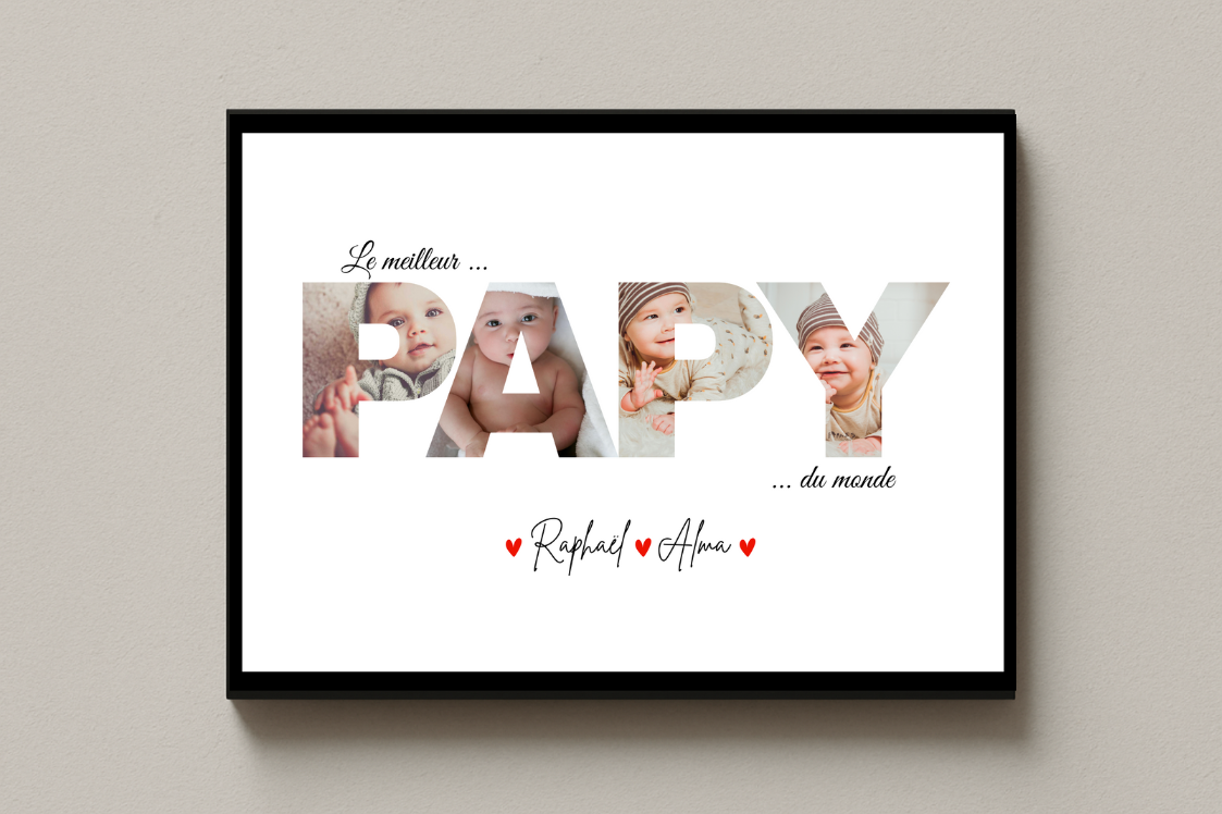 Offrez à votre papy un présent plein de tendresse avec cette affiche personnalisée moderne et originale. Les lettres du mot "PAPY" sont joliment remplies de vos plus belles photos, créant un souvenir unique qui fera battre son cœur.